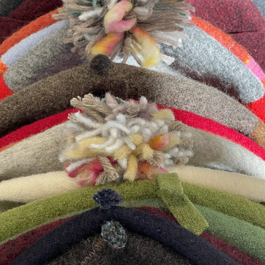 | Diese schönen und wärmenden Kappen gab’s schon mal bei uns. Wir freuen uns, daß wir jetzt ihre neuesten Kreationen zeigen können. Das Lieblingsmaterial für ihre Kappen und Mützen ist hochwertiger Schurwoll-Strickwalk. Er ist wärmend, atmungsaktiv und schützend am Kopf. Sie kombiniert verschiedene Feinheiten des Walks, so dass Reliefeffekte entstehen, außerdem sind die Farbkontraste und Stickereiakzente typische Gestaltungselemente dieser Künstlerin. Neu sind jetzt Mützen mit angeschnittenen Ohrenklappen. |