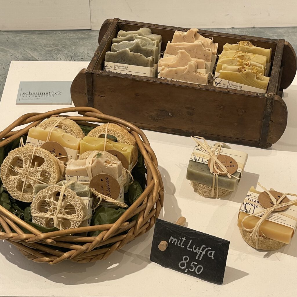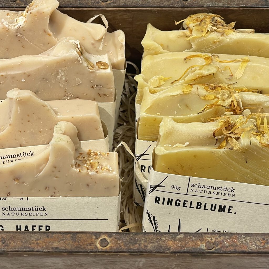 | Amelie Vogel produziert handgesiedete Naturseifen im sogenannten Kaltsiedeverfahren. Pflanzliche Öle und ausgewogene Kompositionen verschiedener ätherischer Öle oder hochwertige synthetische Parfümöle ergeben hochwertige Seifen. Sie werden u.a. mit bunten Tonerden eingefärbt, sind überfettet, dh sehr pflegend und im Gegensatz zu herkömmlichen Seifen auch für trockene Haut geeignet. Wenn ein Peelingeffekt erwünscht ist, sorgen Zusätze wie z.B. gemahlene Kräuter und Haferflocken für einen sanften Rubbeleffekt. Schaumstück.naturseifen.de |