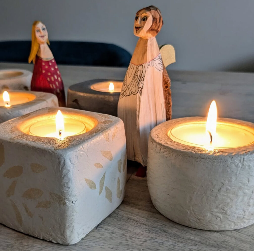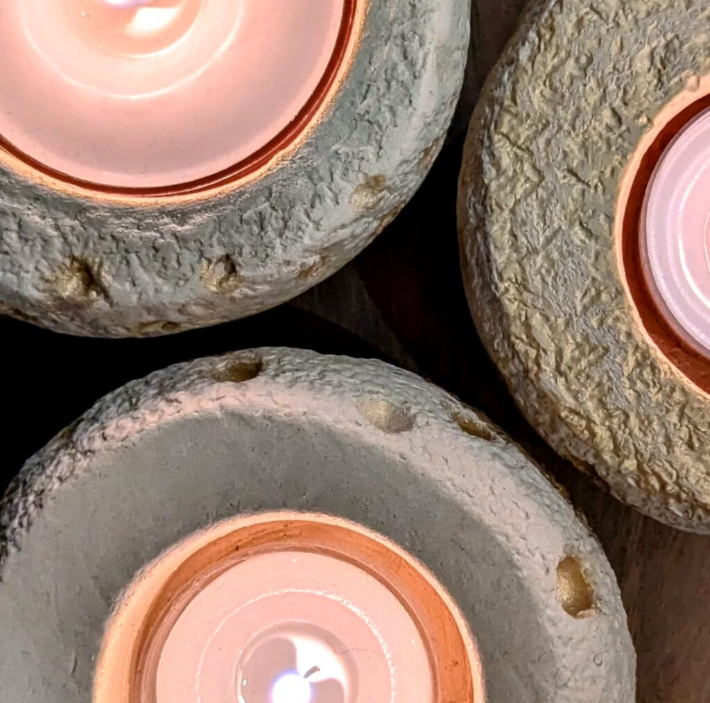 Diese Künstlerin stellt u.a. handgetöpferte Teelichter mit zarter Oberflächenstruktur her, die sie anschließend poliert und wachst.